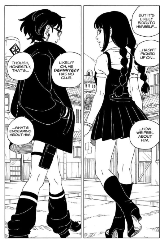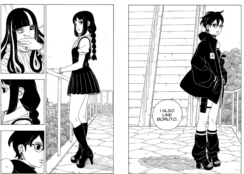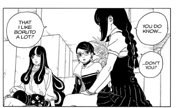 Now you may be thinking, what does Sarada and Sumire come into this? well in chapter 25 of TBV we see that Sarada finally admits her feelings about Boruto and during CH 16, we see Sumire already have feelings and by the end of CH 25, Sarada and Sumire are both in agreement they have feelings for Boruto.